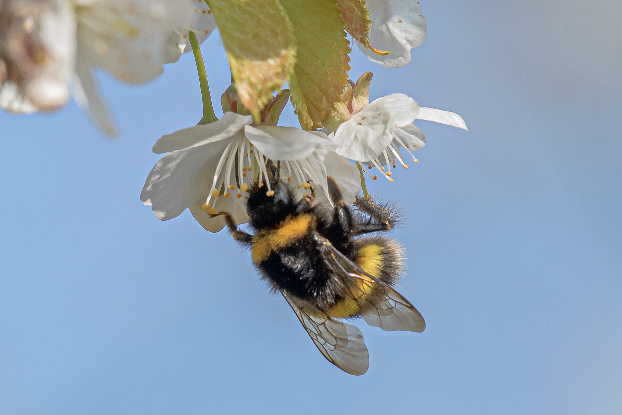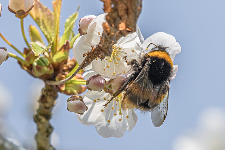 A bumblebee was captured in the act of pollinating a white cherry blossom. Bumblebees, with their robust bodies and fine hair, are particularly effective at pollinating many wildflowers and grasses. Their importance cannot be overstated, as they help in the reproduction of plants by transferring pollen from one flower to another, leading to the production of seeds and fruits. This process ensures the survival of many plant species, which in turn support a wide variety of other organisms within the ecosystem.